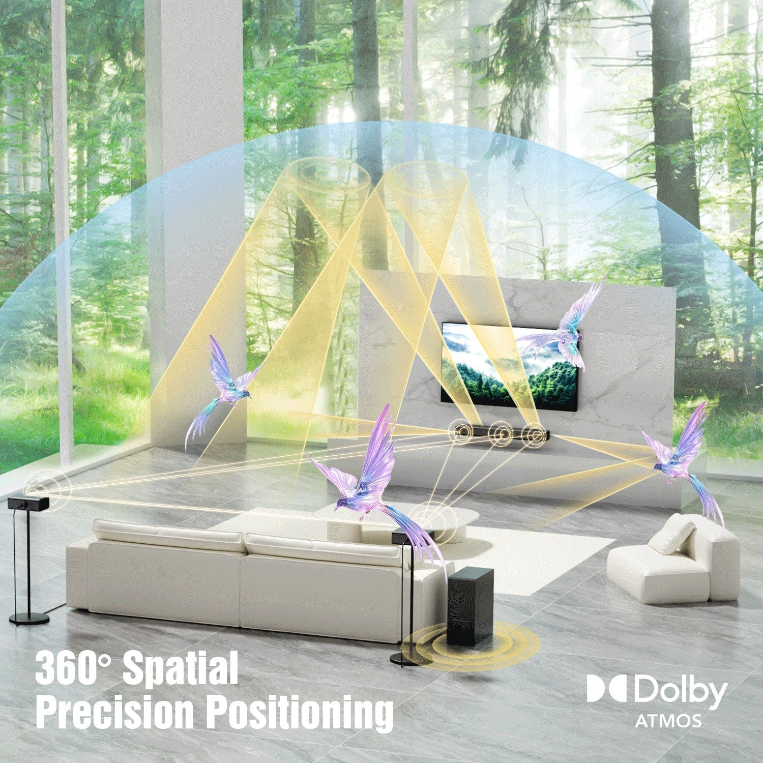 Esta barra de sonido está diseñada específicamente con dos tweeters laterales de aleación de aluminio y magnesio y un tweeter frontal, que ayudan a crear agudos más nítidos y un entorno sonoro más amplio, resultando en un sonido general más equilibrado y rico. Cuatro controladores frontales, dos controladores traseros, dos controladores laterales y dos controladores superiores se combinan a la perfección para mejorar la precisión del sonido, produciendo una calidad de audio más nítida y creando un campo sonoro más rico. Esto da como resultado una experiencia auditiva más inmersiva y tridimensional, haciendo que el sonido de la A512 sea más dinámico y realista en comparación con las barras de sonido 5.1.2 canales convencionales del mercado.