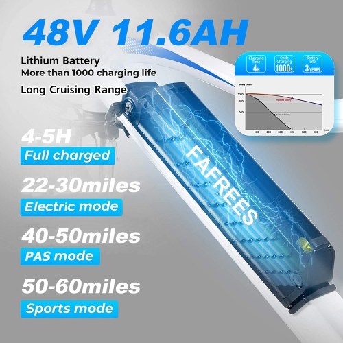 11.6AH batería de alta energía permite a la bicicleta eléctrica para viajar durante 25-30 millas en modo eléctrico puro, y 40-50 millas en el modo de potencia asistida.